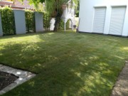 neuer Rollrasen | Terrasse aus Bambus und Geländer aus Edelstahl | Weg neu gepfalstert |