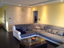 Decke mit RGB-LED und Decke mit LED-Einbaustrahlern | Wand mit Natursteinen verkleidet |